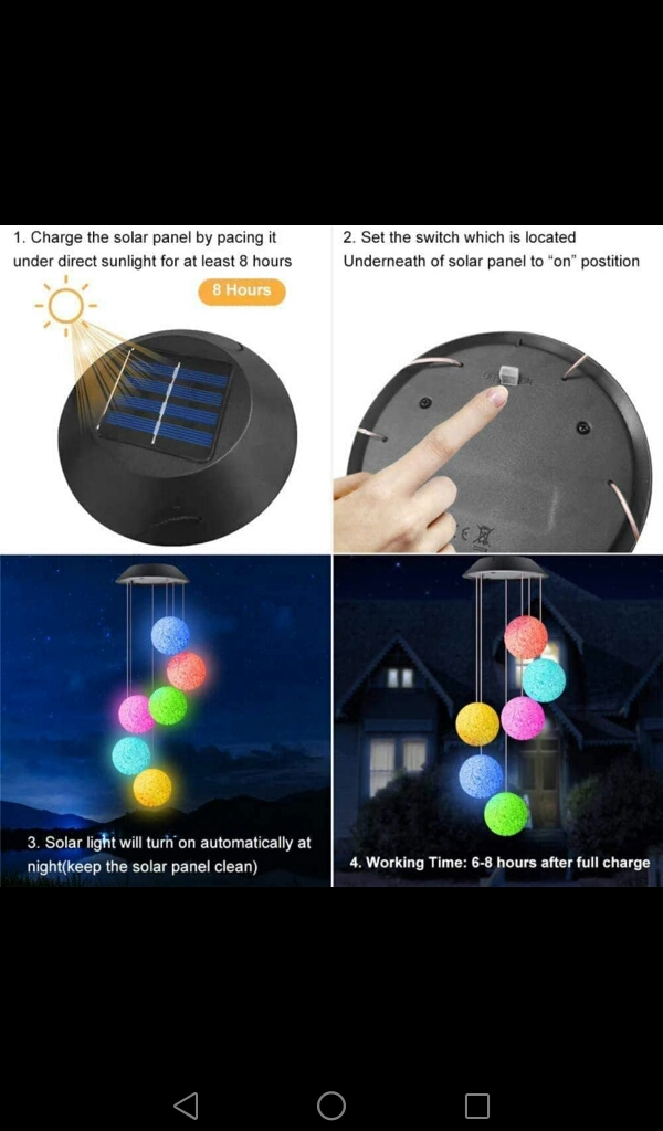 - يتم تشغيل رنين الرياح هذا بواسطة الطاقة الشمسية. ما عليك سوى سحب المفتاح إلى وضع التشغيل الموجود في الجزء الخلفي من اللوحة ووضعه تحت أشعة الشمس للحصول على الطاقة.
