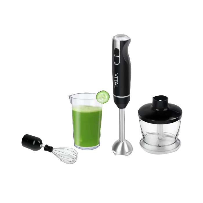 جهاز الخلط الكهربائي 4ب1من ماركة فيتال الايطالي الأصلي مكون من : بلندر , مكسر ,مفرمة الورقيات , كلهم بجهاز واحد وعاء قوي جدا 4 شفرات تيتانيوم ضد الصدأ كفالة سنتين تعمل بقدرة 650 واط عجل للتحكم بتغير السرعة